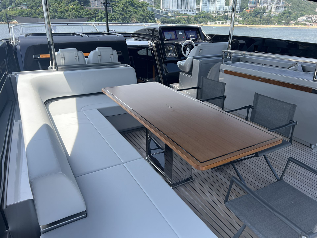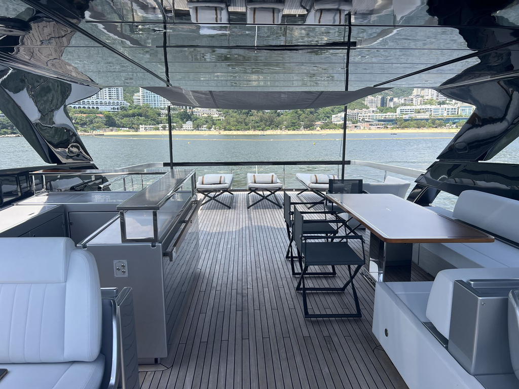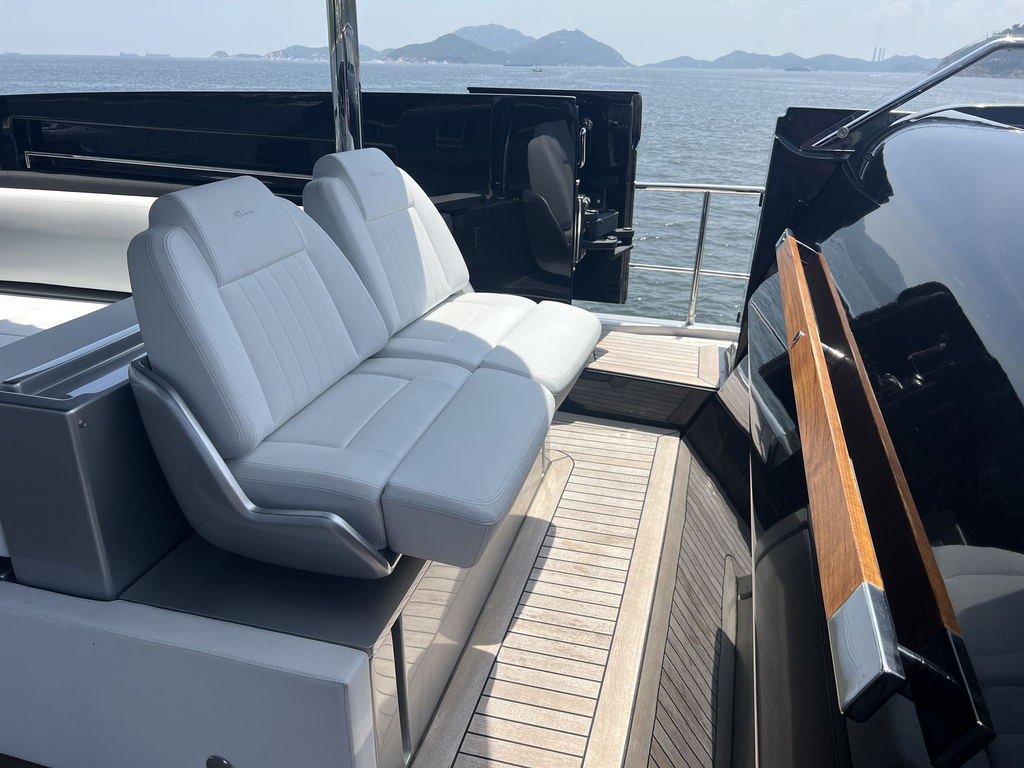 Faithful to the sporty, streamlined lines of its predecessor, the latest addition to Riva's flybridge range has an unmistakable profile, even more elegant and decisive: masterful brushstrokes of dark colour, from the large window that runs along the entire hull to the design of the hard top, create new modern, fluid and harmonious lines, giving life to a boat with a completely new image.